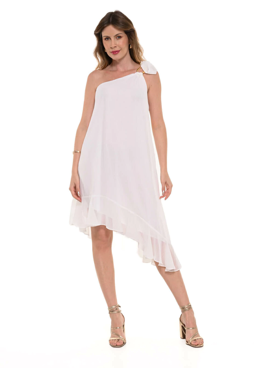 Vestido Bisô curto assimétrico chifon off white. Peça confeccionada em crepe chifon com leve textura, forrado, decote e babados assimétricos, com detalhe de fivela na amarração. Vestido lindo para aquela ocasião especial. Composição: 100% Poliéster/ forro: 100% Poliéster.